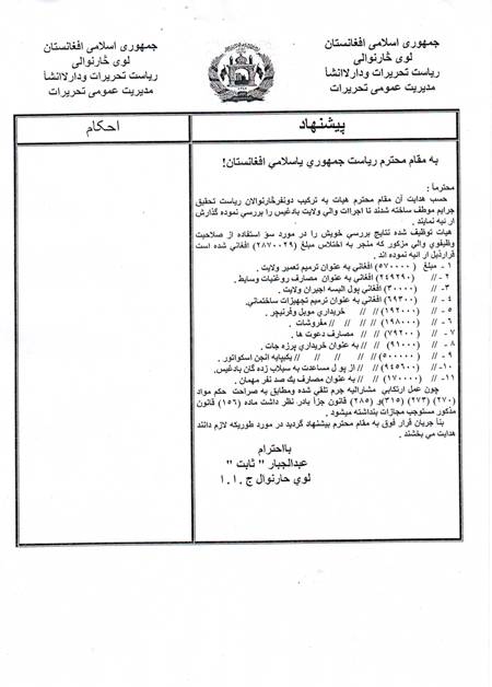 اشاره: اسنادی را که کابل پرس برای نخستين بار از ولايت بادغيس منتشر می کند، نشان از دو ميليون و هشتصد و هفتاد هزار و بيست و نه (2870029) افغانی (معادل تقريبی 57 هزار و 400 دالر آمريکايی ) اختلاس توسط والی بادغيس، آقای توخی را نشان می دهد که توسط هيات اعزامی لوی سارنوال يا دادستان کل آقای جبار ثابت به اين ولايت مشخص شده است. در اين اسناد، گزارش کامل اين هيات اعزامی با تمام جزييات آن و نحوه ی اختلاس و سوء استفاده فاش می شود. همچنين در آنچه توسط کابل پرس فاش شده، نامه ی بدون امضای آقای ثابت به رييس جمهور می باشد که بدليل سفر ايشان به خارج از کشور تاکنون شکل رسمی نگرفته و به امضای ايشان نرسيده بود. اميد، اکنون که ايشان به کابل بازگشته اند، بصورت جدی، نسبت به، به محاکمه کشيدن آقای نسيم توخی والی ولايت بادغيس اقدام کنند.