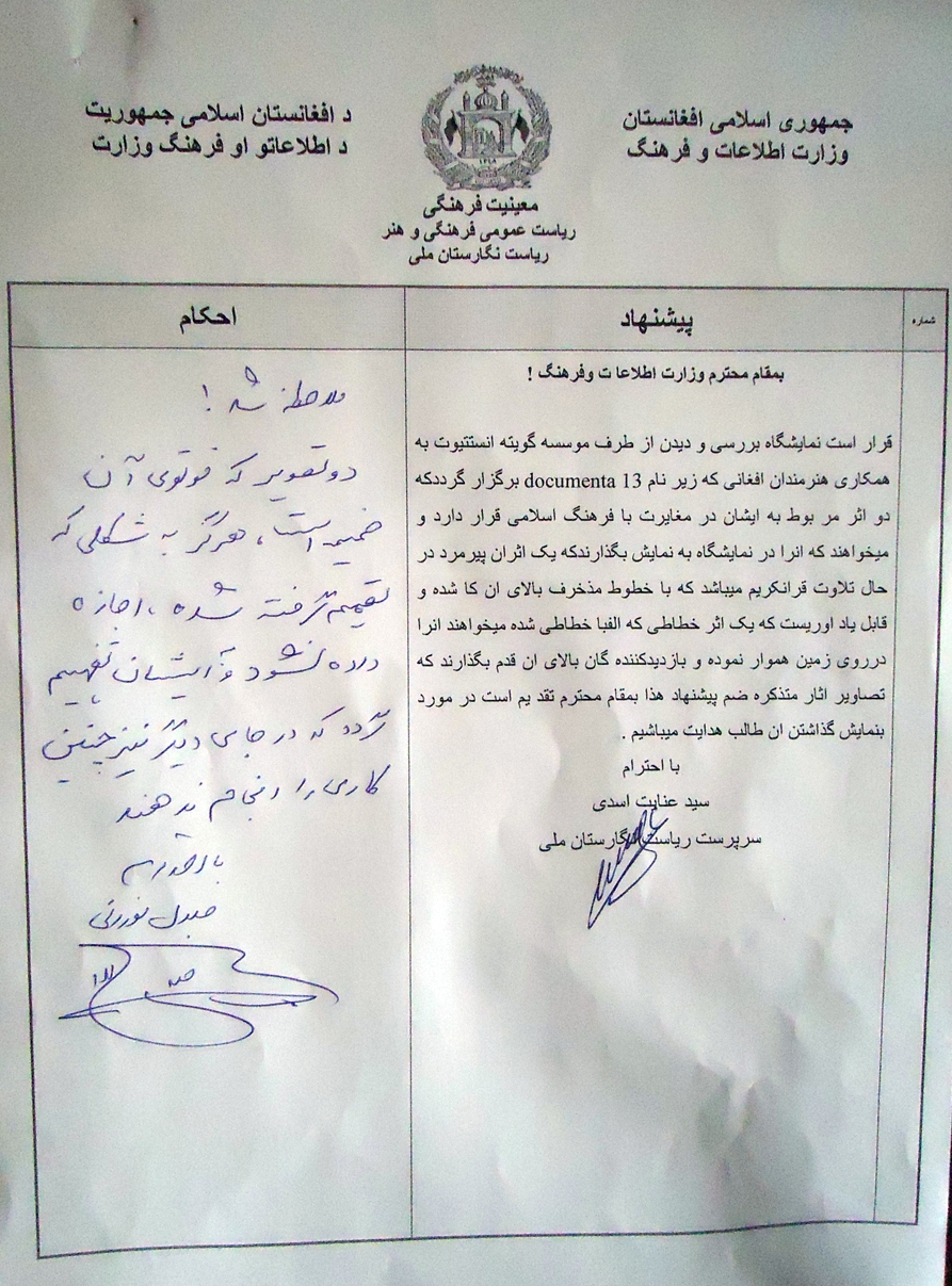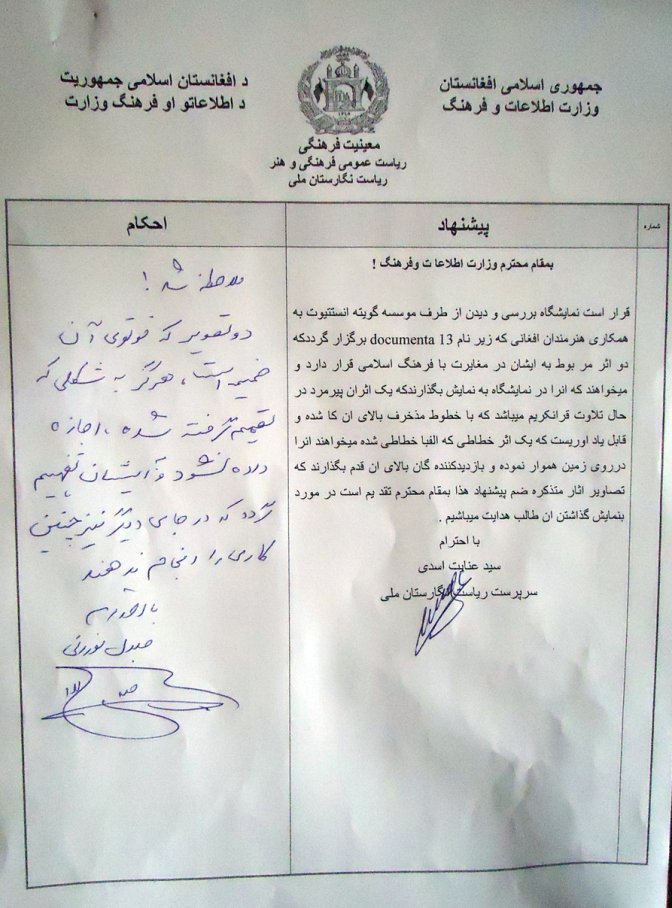 اولا دواثار ایکه وزیر و وزاراتش مانع نمایش انها شده اند باید نشر شود تا همه انرا ببینند و بدانند که که ایا درست است که ادعا شود وزیر و یا کسانی دیگری بخاطر هزاره بودن این دو نفر چنین عملی را مرتکب شده اند , زیرا فاشیزم هزاره گی در بعضی ها وجود داشته هر عملی را رنگ و بوی هزاره گی میدهند هدف من به هیچ وجه دفاع از وزیر کرزی نیست این وزیر از وزیر قبلی کمی خوبتر است .
