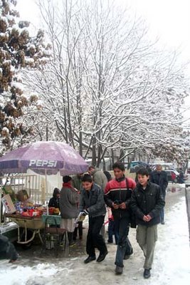 The roads are very slippery and the brakes don’t work well. Assad enjoys driving fast, as always, which I don’t let him do now, when it is so dangerous with so many people walking on the narrow roads of Dasht e Barchi. Some carry snow-shovels to sell. Some have bought them and shout, “Snow shoveling, snow shoveling!”