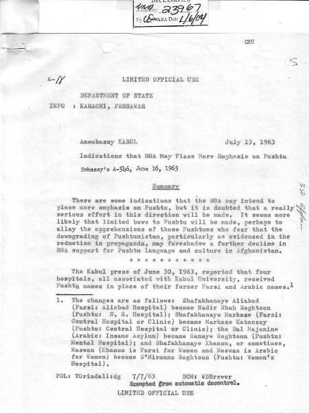 کابل پریس مورخ 30 جون 1963 گزارش داد که چهار شفاخانۀ مربوط به دانشگاه کابل، بعوض نامهای فارسی وعربی دارای نامهای پشتو شدند (1).