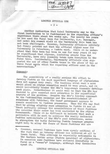 مسئله پشتو منحیث زبان ملی افغانستان دراین اواخردرگفتگو با دو منبع افغانی، یک پشتون (دارای علایق قبایلوی) ویک فارسیوان (3) مطرح بحث قرارداده شد. در حالیکه پشتون ازوضع ناراض وغمگین بود، با شک وتردیدی فارسیوان همنوا بود که حکومت، تمایلی درجهت انکشاف پشتو منحیث زبان اولی، وحتی کمتراز یگانه زبان رسمی، افغانستان داشته باشد. آنها بطوراستهزا آمیزبه یکی ازفرمانهای حکومت اشاره کردند که درسالهای 1932 یا 1933 صادر واعلان شده بود که، درجریان سه سال، پشتو یگانه زبان رسمی کشور خواهد گردید، وبصورت عام این امکان را رد کرد که تغییرنامها میتواند اشارۀ به علاقمندی مجدد حکومت به زبان پشتو باشد.