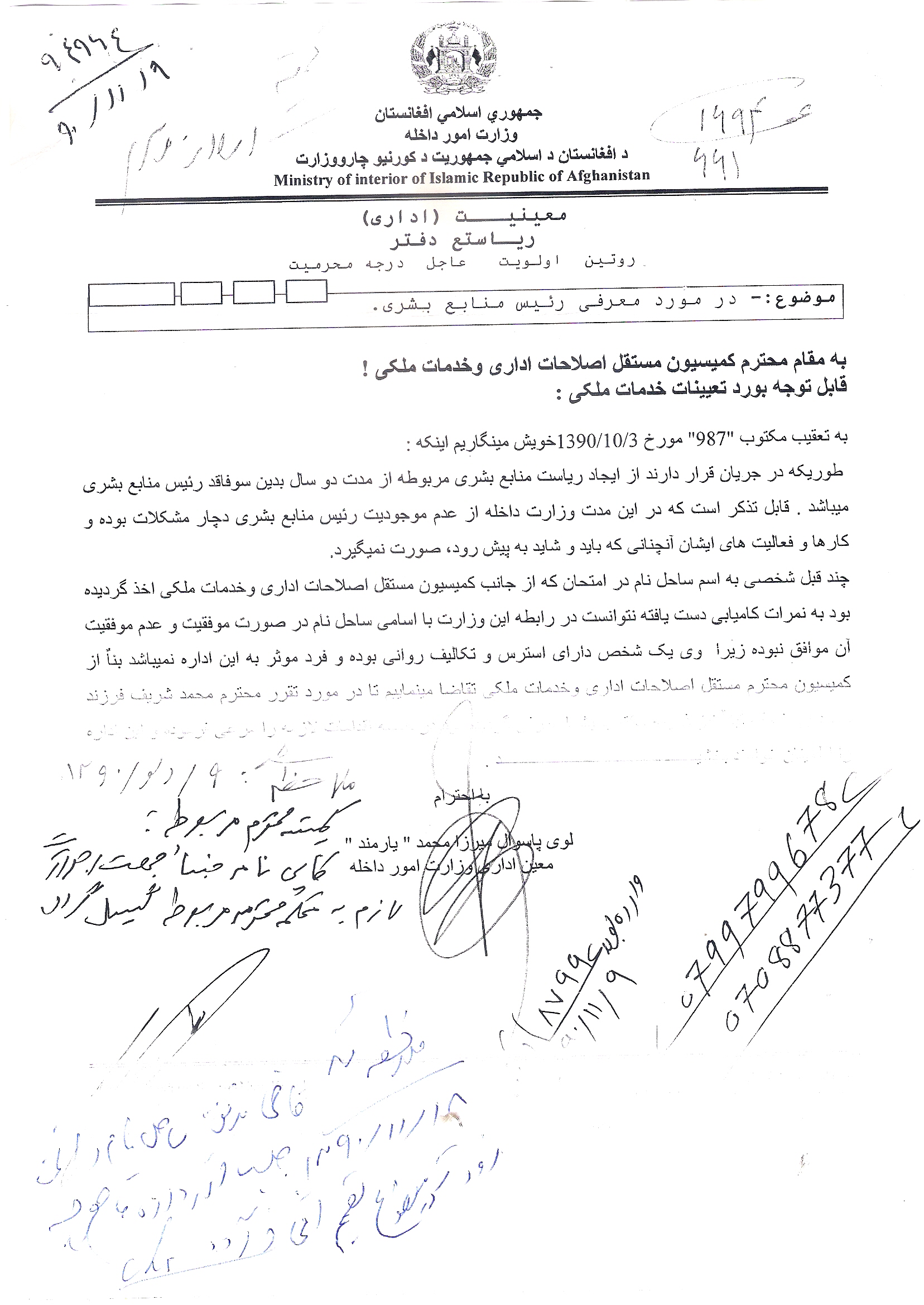 لازم به تذکر دانسته میشود که تا اکنون مدت اضافه تر از یکنیم سال میگردد که کیس پست ریاست منابع بشری وزارت امورداخله با وصف اینکه در محکمه رسمی دولت تحت بررسی قرار دارد ولی بنا بر معاذیر و خلا هائیکه در قوانین و صلاحیت های قضات و اهل خبره وجود دارد, هیچکس و هیچ مقام حاضر نمی گردند تا نتایج پارچه های امتحانات تحریری و تقریری بنده را در روشنی علوم اجتماعی و علوم بشری بطور عادلانه بازنگری کنند, در حالیکه ادارۀ اصلاحات اداری و خدمات ملکی افغانستان در مطابقت با پیوند های شخصی, تنظیمی و قومی نه تنها در راستای ارزیابی نتایج بی عدالتی و حق تلفی نموده و مینمایند بلکه پروسۀ اصلاعات اداری را مخصوصا شفافیت رقابت آزاد را با مداخلات غیر قانونی اشخاص و افراد مصلحتگرا و نشنلیستان فاسد و بی کفایت مساعد ساخته اند.