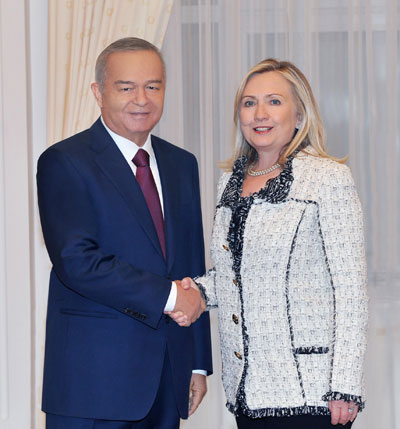 Note: The top photo depicts Secretary of State Clinton in one of her meetings with Uzbek dictator Islam Karimov. She was last in Uzbekistan in December, 2011. Just as the Arab Spring was beginning in the Middle East, an Uzbek Spring was quietly being suppressed with Obama Administration support. The photo below shows Secretary Clinton greeting brutal Libyan secret police chief Mutassim Qaddafi at the State Department on April 21, 2009.