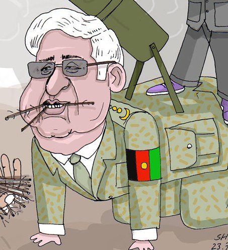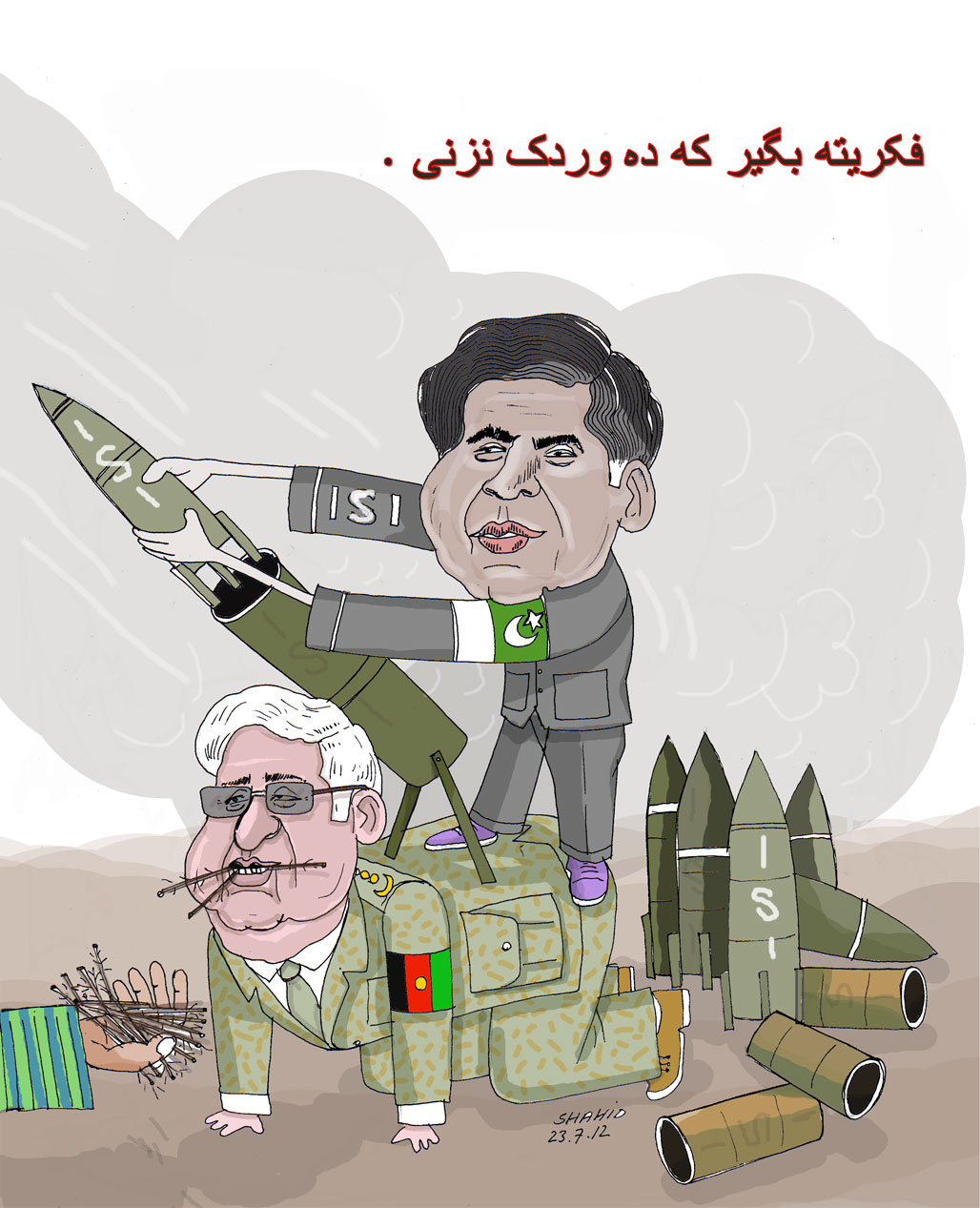 شاهد عزیز چگونه وجود کثیف این به اصطلاح مقام اول دفاع ملی وطن را ترسیم میکند و چگونه شعار کاه میخوریم و از وطن دفاع میکنیم را که حامد کاکوی کاه خور در وقت نشه چرس گفته بود منعکس ساخته است.از شاهد تقاضا میشود تا کارتون مارشال گیلنه و آخوند خلیلی معامله گر را نیز ترسیم دارند تا دیده شود حلقه نامردان چرا خاموش راکت پرانی ها آی اس آی اند. خدا داود خان و داکتر نجیب را بیامرزد. اگر یکی آنها زنده میبود پوز آی اس آی را بخاک میمالید.