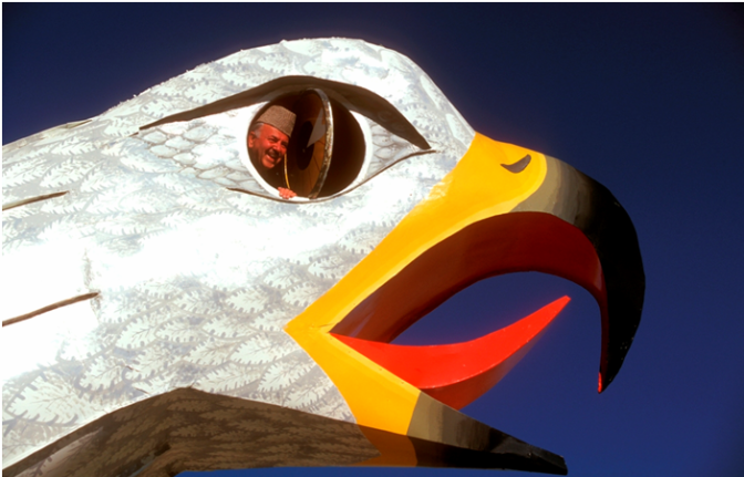 سید منصور نادری داخل تندیس عقاب که مهمان خانه برای پذیرای مهمانهایش بود.