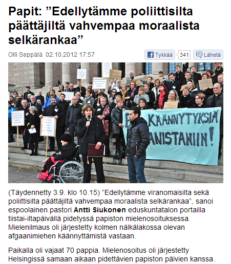 جمعی از این کشیشان روز دوم ماه اکتبر در کنار این سه پناهجوی افغانستانی مقابل پارلمان فنلاند قرار گرفتند و به نقد سیاست های ضد مهاجرتی دولت این کشور پرداختند.