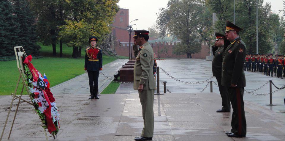 جنرال اشفاق کیانی رئیس ستاد ارتش پاکستان درحال ادای احترام بالای قبرسربازان روسی که درجنگهای دههء هشتاد درافغانستان کشته شده اند
