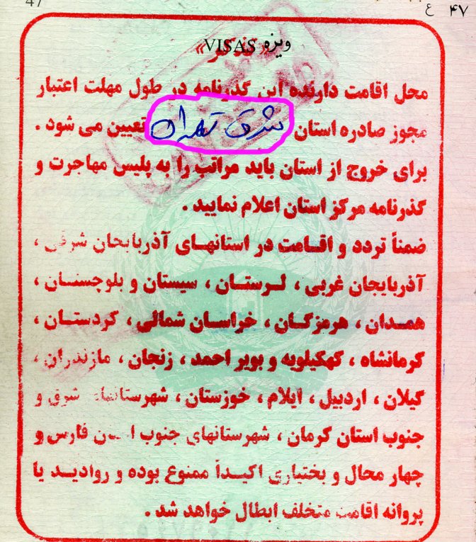 پلیس مهاجرت ایران از محل (تعین شده) در پاسپورت خود، خارج نشوند.