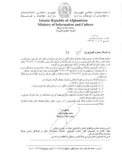 شورای سراسری علما، شورای ملی، و وزارت اطلاعات و فرهنگ در تاريخ 11/1/1387 به عمل آمده، بايد نشر برخی برنامه های خود را تا تاريخ 26/1/1387 قطع نمايد.