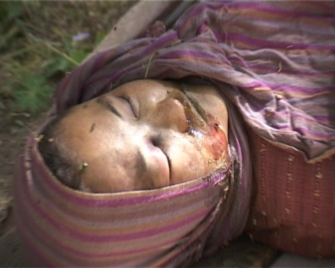 اجساد در روی زمین با روی شان خوابیده بودند و دستهایشان تمامأ در عقب شان بسته بودند. زخمهای مرمی از پشت دیده و تشخیص داده نمیشد لکن خون در روی زمین زیر سینه هایشان دیده میشد. من اجسادی را دیدم که 4 روز قبل کشته شده بودند. اجساد شان نه پندیده بودند ولی خون واضحآ از سینه های شان سرازیر شده بودند ولی من فهمیدم که از پشت سر فیر صورت گرفته است زیرا در دیگر قسمت های بدنشان علامت زخم دیده نمیشدند و در دریای خون که از سینه هایشان خارج شده بود شناور بودند.