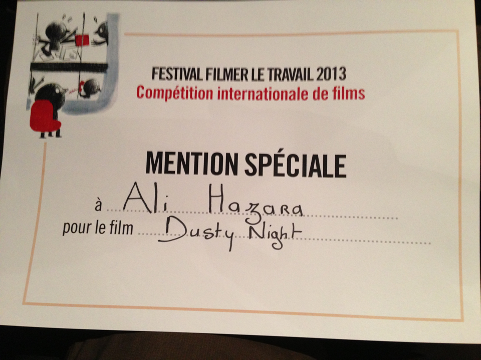 ساعتی پیش آقای علی هزاره فیلم ساز، برنده نگاه ويژه جشنواره فیلم Filmer le travail در فرانسه شد و هنگام دریافت این جایزه، آن را به صدها قربانی حمله ی خونین بر مردم هزاره در شهر کویته ی پاکستان تقدیم کرد.