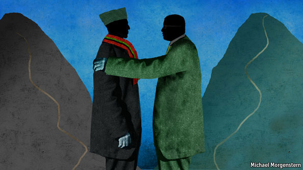 در مقابل، به نظر میرسد که جانشین آقای مشرف، آصف علی زرداری، در وجود کرزی بهترین دوستِ خود را پیدا کرده باشد. این هفته در بریتانیا، این دو همتا با میزبان خود، دیوید کَمرون، نخست وزیر بریتانیازیرِ یک سکو، با هم خندیدند، دست هم را محکم فشردند و باهم قول دادند. آقای کَمرون آن را یک "سطح بی سابقه ی همکاری" این دو همتا نام برد. آنها حتی با هم موافقت نمودند تا در راستای یک توافق صلح با طالبان در شش ماهِ آینده همکاری کنند. این نشان دهنده ی یک تغیری در راهبرد پاکستان عمیقتر از آن است که توضیح آن را در شخصیت لینت آور آقای زرداری دریافت نمود.
