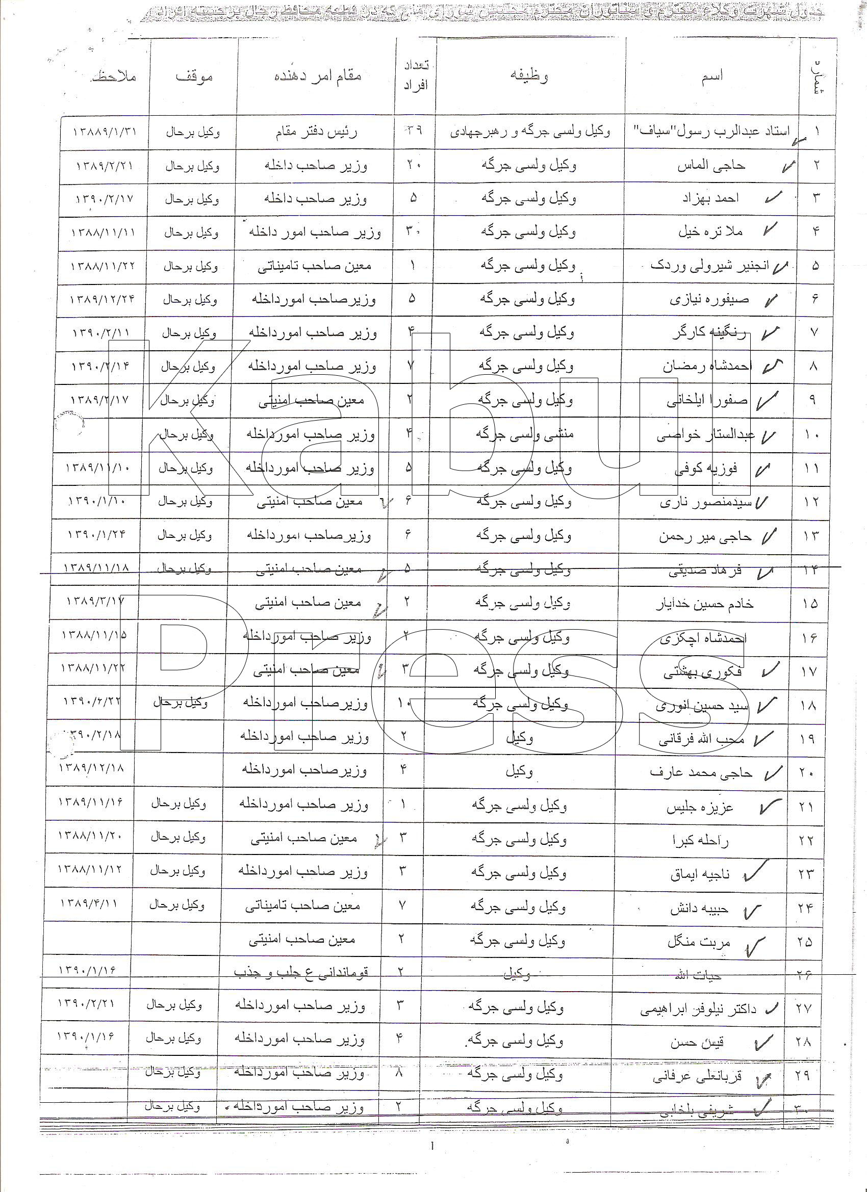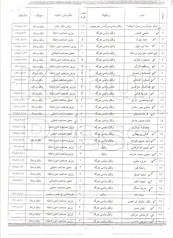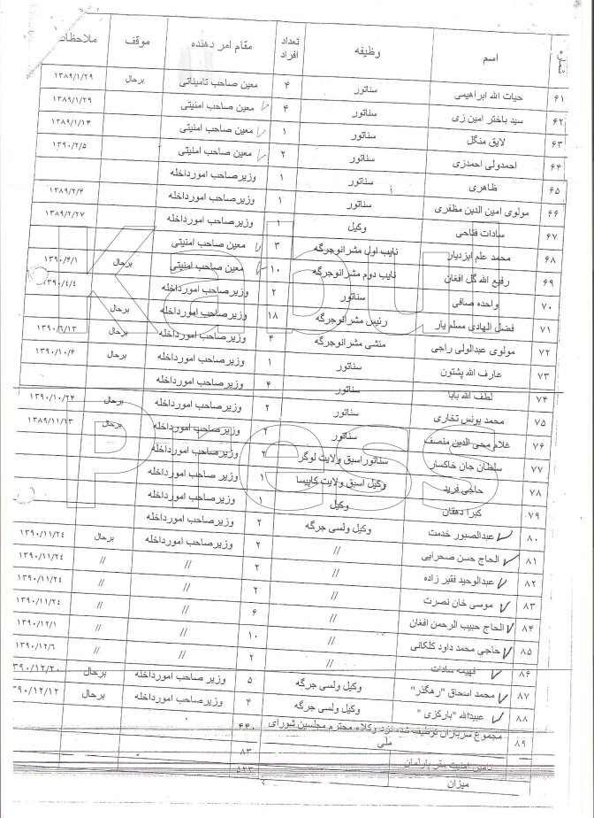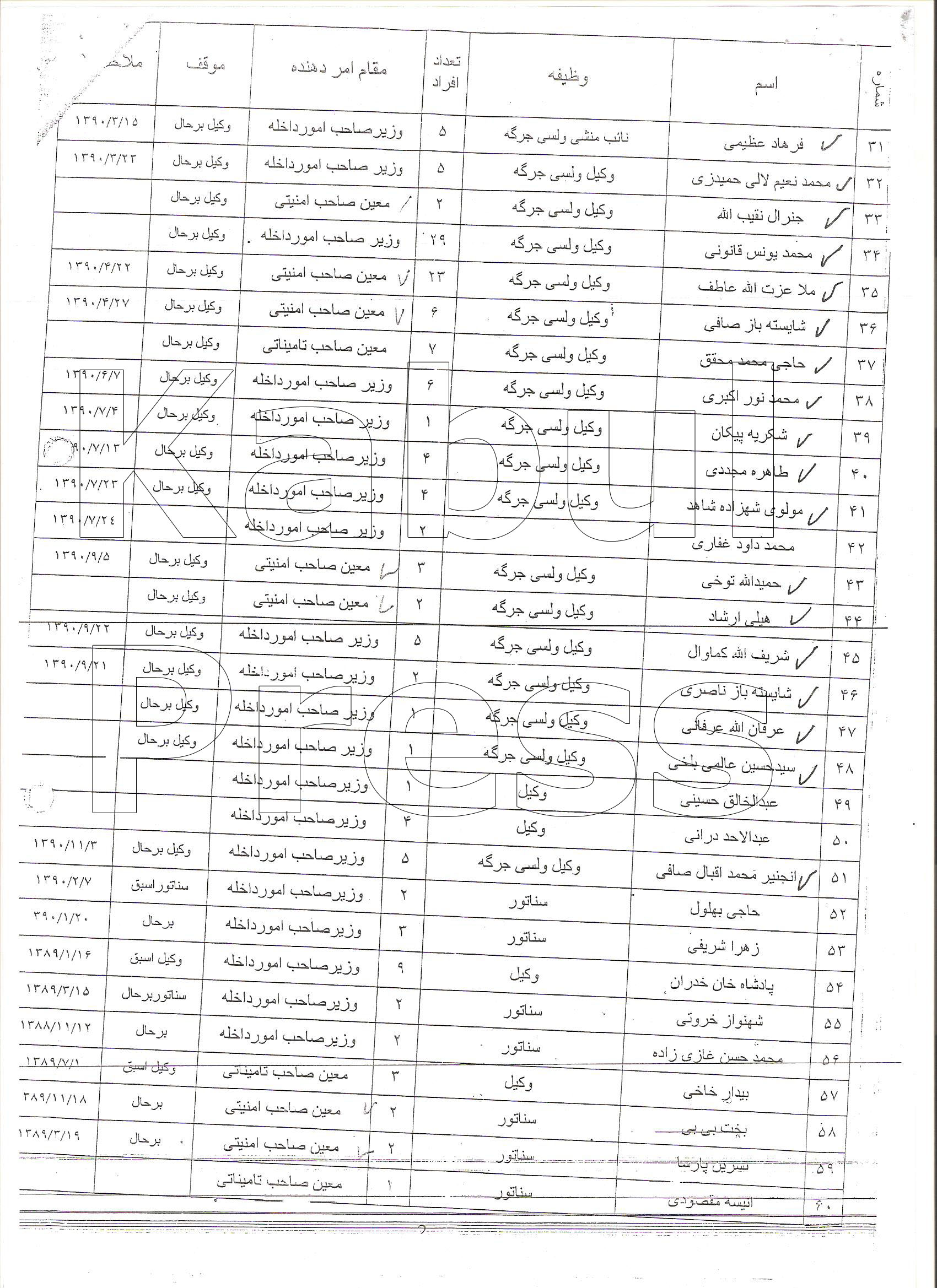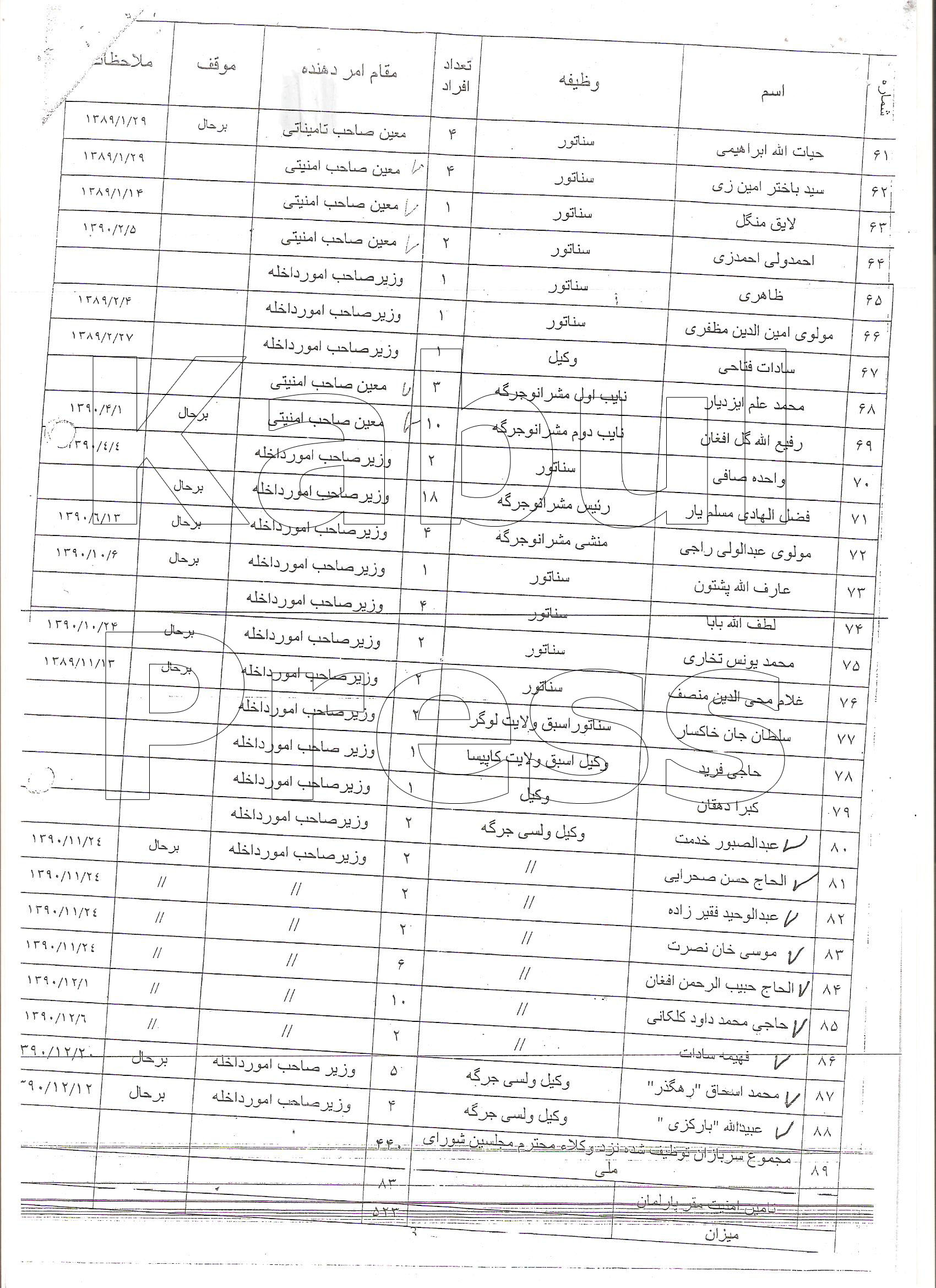 این فهرست نشان می دهد که رسول سیاف با داشتن 39 محافظ، ملا تره خیل کوچی 30 محافظ، حاجی الماس 20 محافظ، محمد یونس قانونی 29 محافظ، ملا عزت الله عاطف 23 محافظ و فضل الهادی مسلم یار 18 محافظ بیشترین محافظان را در بین وکلا و سناتوران دارند. در جمع دریافت )