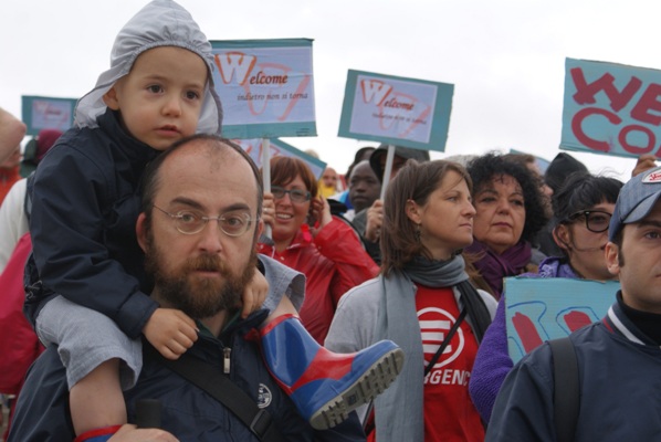 تظاهرات تحت نام (WELCOME) درساعت 9 صبح همزمان در بنادر شهرهای ونیز، انکونا، باری، برندیسی درایتالیا وشهر های پاترا، ایگومونیتزیا وآتن درکشور یونان؛ باحضور هزاران نفر آغاز وبا وجود باران شدید تاساعت 12:30 ادامه یافت. آقای جینو سترادا رییس سازمان امرجنسی ایتالیا باحضور دربین تظاهرات کننده گان درشهر ونیز، فرش سبزی را که درآن واژه Welcome نوشته شده بود؛ جلوی دروازه بندر گاه کشتی، جایی که ازسال 2008 تاحال شاهد مرگ پنج نوجوان افغانستانی وعراقی بوده است؛ پهن کرد وپس ازآن درسخنرانی اش برخوردهای دولت ایتالیا نسبت به پناهنده گان را محکوم نموده وازدولت خواست برای اینکه نسل آینده ایتالیا شرمسار تاریخ نباشد باید ازسیاست های فاشیستی دست کشیده وبه تعهدات بین المللی وحقوق بشری اش پابند باشد. جینوسترادا افزود ؛ نوجوانان زیادی ازافغانستان وکشور های دیگر به دلیل زنده ماندن وفرار ازوحشت وترور فرار میکنند و با شعار های حقوق بشری که ازکشورهای غربی میشنوند، اینجا پناه می آورند واین واقعن شرم آوراست که این نوجوان درجلوی دروازه های مان زیر لاستیک های کامیون، تکه پاره شوند. اوگفت ما شاهد روزی خواهیم بود که ایتالیایی ها به دلایل رشد فاشیزم مجبور شوند این کشور را ترک کنند وبه کشورهای دیگر پناهنده گی را اختیار کنند.