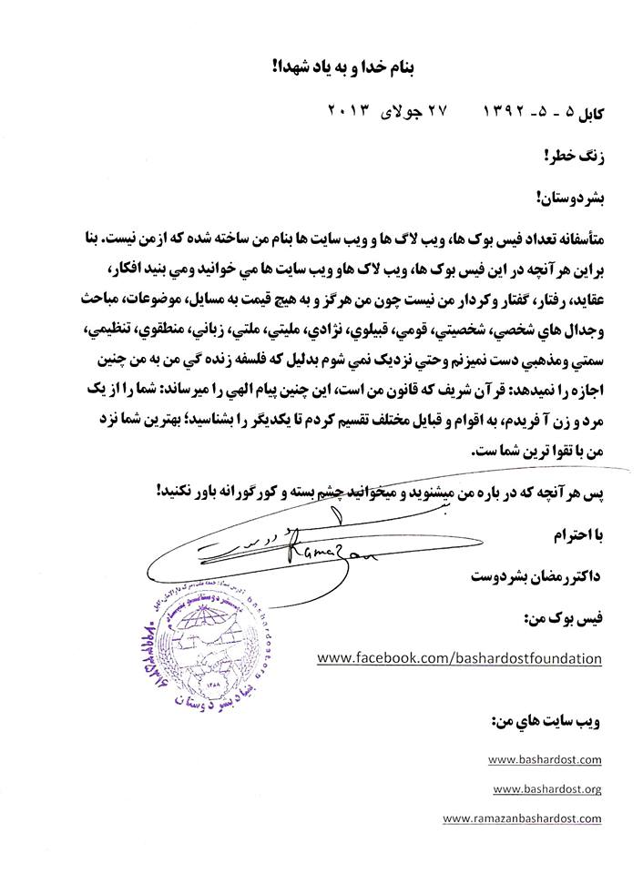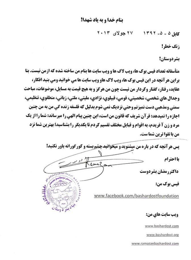 کابل پرس?: از مدتی به اینسو برخی از صفحات فیسبوک بنام داکتر رمضان بشردوست ایجاد شده که برخلاف سیاست ایشان که بصورت مشخص برای تخریب شخصیت ایشان می باشد. آقای داکتر رمضان بشردوست با فرستادن پیام زیر به کابل پرس، در این مورد توضیح می دهند.