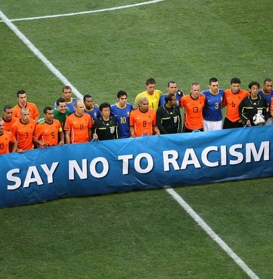پيش از آغاز رقابت تیم های فوتبال برزیل و هلند، بازیکنان در میانه ی میدان"به تبعیض نژادی "نه" بگویید" را خواستار شدند. مبارزه با نژاد پرستی یکی از شعارهای اصلی فیفا در جام جهانی امسال است.