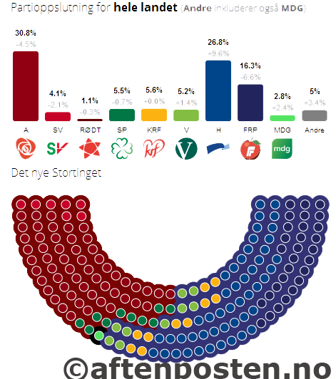 حزب کارگر ناروی که در دور قبل توانسته بود 68 کرسی را در اختیار داشته باشد، با از دست دادن 13 کرسی، 55 کرسی را در اختیار گرفته است.