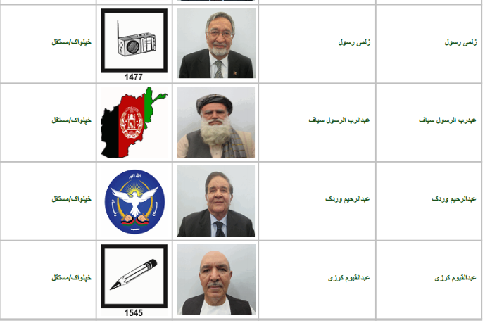 قطب الدین هلال، عبدالله عبدالله، زلمی رسول، عبدالرب رسول سیاف، عبدالرحیم وردک، عبدالقیوم کرزی، محمد اشرف غنی احمدزی، محمد شفیق گل آغا شیرزی، محمد نادر نعیم و هدایت امین ارسلا