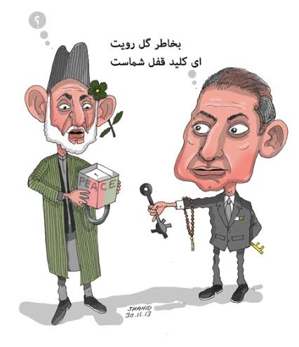 کرزی غواړي، افغانانو ته د سولې او امنیت پشان د حساسو غوښتنو په پرلپسې شخوند او پرهغو باندې په مکرجن ټینګار سره، امنیتي تړون یرغمل کړي او بیا دا یرغمل د خپلو شخصي موخو لپاره لکه په راتلونکو ټاکنو کې د خپل بانډ د حتمي بري لپاره د یوې وسیلې پتوګه وکاروي!