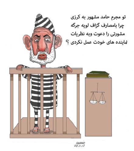 امروز جناب کرزی با شیادی وفریب کاری از استقلال وعزت مردم افغانستان در لویه جرگه سخن میگوید و طوری وانمود میکند که ایشان به عنوان مرد ازاده ، وطن دوست وبا ایمان مخالف امضا این توافقنامه است درحالیکه حکومت داری ده ساله ایشان و فساد بی داد گر اطرافیان ومتحدین وبرادران شان آبروی این کشوررا درسطح جهان برد ودولت ایشان به عنوان فاسد ترین دولت درجهان معرفی شد آیا این داد وفریاد ها وحقه بازی های ایشان میتواند گذشته سیاه وننگین ایشان را سفید و پا ک سازد وآیا مردم افغانستان میتوانند باورکنند که این داد وفریاد ها بخاطر حقوق مردم افغانستان است ویا هم برای خواسته های پنهان و زیرکاسه که هنوز برای مردم ما برملا نشده است … خداوندا این ملت مظلوم وبیچاره مدد گارو پناه گاهی بجزتو ندارد.