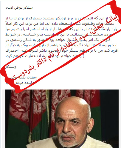 در یکی از این بیانیه های جعلی، طرفداران اشرف غنی احمدزی از قول داکتر بشردوست نوشته اند که او در انتخابات ریاست جمهوی سال آینده از اشرف غنی احمدزی حمایت می کند. این در حالی ست که در انتخابات ریاست جمهوری قبلی، اشرف غنی احمدزی با وجود هزینه کردن بیش از نیم میلیون دالر، رای ناچیزی را نسبت به آرای داکتر بشردوست بدست آورده بود.