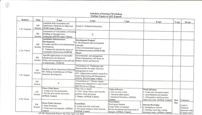 آقای Shipin كه لكچر خود را در باره محیط زیست به زبان انگلیسی میداد وترجمان هم نداشت استادان از جمله خود جناب حبیب الله خان چهار مضمون ناكام چیزی از آن نفهمیدند وفقط كله می جنباندند. موضوعاتی كه توسط استاد رهنمای حبیب الله چهار مضمون ناكام ارائه شد اینها بودند. به جدول ذیل نگاه كنید.
