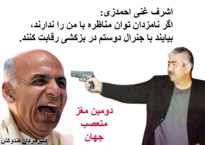 من به صفت يك أفغان براي تمام تان ميخوام بكوايم كه إز اين ذشت كفتن تير شويد دلتان يك جاي ديكر خالي كنيد، اين كه جنرال دوستم زور داردً و جناب اشرف غني عقل براي هركس معلوم است و انشاله ب أساس كفته دوستم كه ميدان ميبرد ونفاق انداختن كار شيطان است بس، زنده باد أفغانستان واحد،Mr ha ha