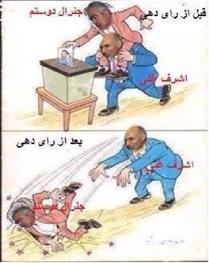 اشرف غنی کوچی زاده یک قوم گرای فاشیست متعصب و کهنه فکر است که اعتقاد به عدالت و برابری نداشته مانند حفیظالله امین خونخوار بوده و در لباس دموکراسی و غربگرایی به مانند گرگ در لباس گوسفند است که پشتون ها وکوچی هارا صاحب اصلی اوغانستان و ازبک تاجک هزاره را درجه دوم سوم و چهارم نوکر ونفر خدمت و کاتب حساب میکند.به یک کلمه اشرف غنی کوچی قوم گرا فاشیست طالب نکتای دار است .دوستم ارا ازبک های باید در پای فاشیست طالب نکتایی دار ضایع نکند. عبالله یا دبل عبالله هم از گروه انحصار گر قوم گرا است که در گذشته نوکر مسعود جنایت کار بود و تفکر انحصار گرایی داشته و به عدالت اجتماعی باور ندارد. دوستم محقق و خلیلی باید متحد بوده و در پهلوی تاجک ویا پشتون میانه رو و معتقد به عدالت اجتماعی قرار گرفته و مطابق شعاع وجودی قوم هزاره و ازبک سهم خود را در قدرت دولتی بدست اورد در غیر ان دبل عبدالله و اشرف غنی کوچی زاده گرگان در لباس میش است.