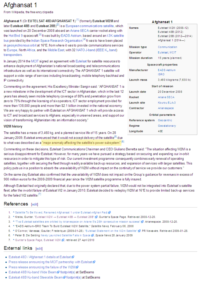 ماهوارهای که «افغانست یک» نامگذاری شده و به زودی در مدار ٤٨ درجه شرقی در فضا جابجا میگردد، قبلا به علت «نقص شدید فنی» از دایره تجارتی یوتلست خارج گردیده و طی دو سال اول قرار گرفتن در مدار زمین عملا بدون استفاده و سرگردان در فضا گشت میزد.