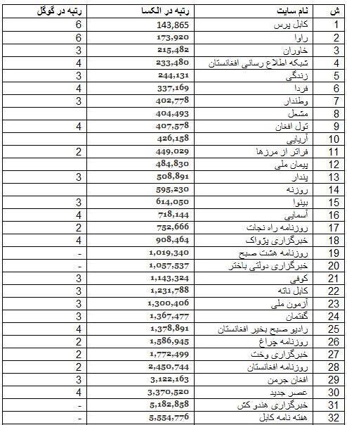 در جدول زير 32 سايت اينترنتی فهرست شده اند که حدود يک سوم آنان نسب به ديگر سايت های افغانستان، خوانندگان قابل توجهی دارند. در اين بين برخی از سايت های اينترنتی هستند که علی رغم تبليغاتی که بيرون از اينترنت برای آنان می شود نتوانسته اند، نسبت به سايت های بالای جدول، خواننده و بازديد کننده جذب کنند. اين سايت ها، سايت های خبرگزاری ها، روزنامه ها و هفته نامه ها در افغانستان می باشند که در ميان اين کم بيننده ها، تعدادی نيز وجود دارد که فقط سايت مجرد اينترنتی هستند و کدام رسانه ای بيرون از اينترنت با آنان بسته نيست.