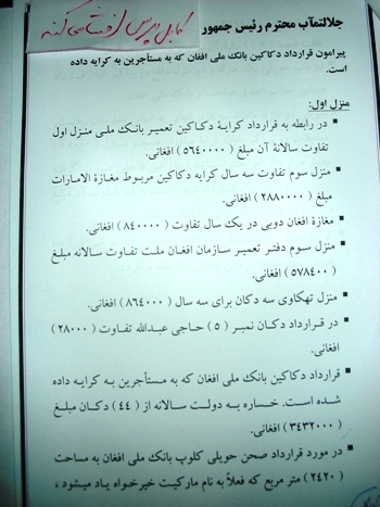 موضوع اين اختلاس و سوء استفاده ها، قرارداد دوکان های بانک ملی افغان می باشد که در چند مورد کرايه، اين سوء استفاده ها به چشم می خورد. تنها در همين مورد کرايه دادن دوکان ها و همچنين دو حويلی در منطقه ی وزير اکبرخان کابل، بيش از يک ميليون دالر سوء استفاده و اختلاس شده است.