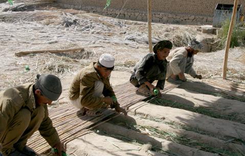 Turkmen men weaving bamboo together in the Mawla Ali area of Marzar-i-Sharif.