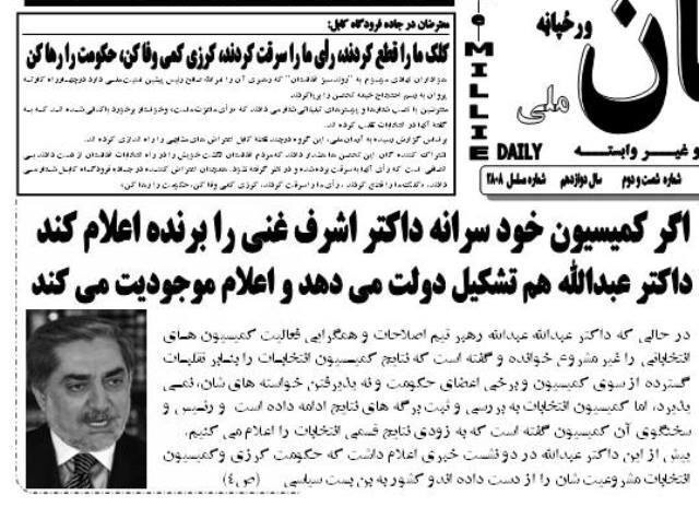 داكتر عبدالله براي اعلام حكومتش چاره ندارد نتيجه انتخابات با تقلب گسترده دوره دوم را بي اعتبار اعلام نموده و خود را برنده اكثريت آراي دور اول بداند تا بتواند در صحنه سياسي حرفش قابل شنود شود در غير آن با صبر و نظاره نمودن وضعيت فريب دهنده فعلي به مرض خودكشي سياسي (شايد مرگ تدريجي سياسي) دچار شده بازنده ميدان سياست معرفي گردد.