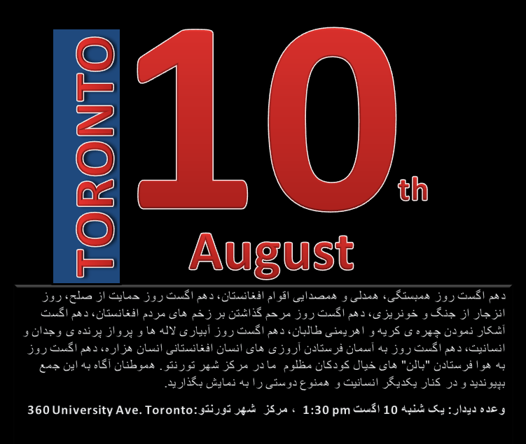 هزاره ها و سایر اقوام مقیم تورنتو همچو تصفیه های قومی را یکسره محکوم میکنند و عمیقترین مراتب تسلیت شان را به پیشگاه خانواده، دوستان و بازماندگان قربانیان تقدیم میدارند. به همین منظور روز یکشنبه 10 اگست در مرکز شهر تورنتو گردهمای اعتراضی سازمان داده شده است، صمیمانه آرزومندیم با اشتراک فعال و همه جانبه تان زمینه این همایش و تظاهرات را استوارتر و نیرومندتر سازید: