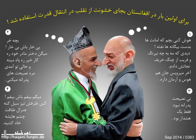 پرویز خان، به بخشید جناب حقانی ، در هرسال ۳۶۶ روز، برای کرزی، کاریکاتور های گاو و خر و میمون و..و کشیدند! گویا از امروز نوبت اشرف غنی است سوژه همیشه گی هم همان« تقلب» است! گویا دفعه اول است که در دنیا، تقلب شده!