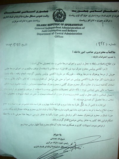 اشاره: آنچه در ادامه می آيد، دو سند مربوط به طالب بودن يکی از جنرالان وزارت داخله ی افغانستان و تقلب در اسناد تحصيلی وی می باشد . يکی از اسناد مربوط به دوره ی طالبان و با امضای مولوی شيرمحمد- عتيق پيژندوال وزارت داخله بوده و سند ديگر امضای آقای ذبيح الله عصمتی، سابق رييس حوزه ی ادارات مرکزی رياست مستقل مبارزه با فساد و ارتشای اداری را در پای خود دارد.