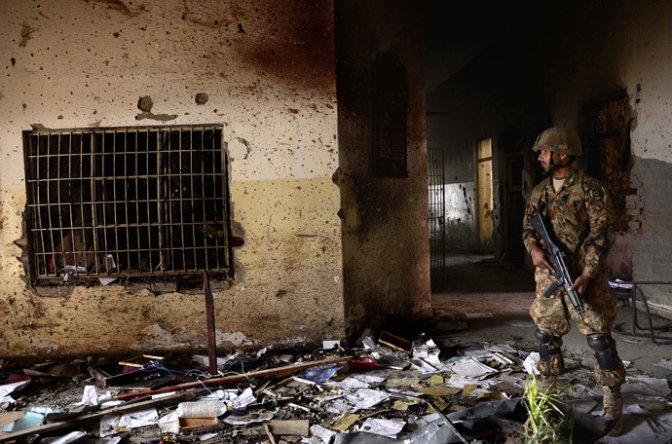 In this photograph taken on December 18, 2014, a Pakistani army soldier stands guard at the site of a militant attack on an army-run school in Peshawar. (AFP Photo / A Majeed / Files)
