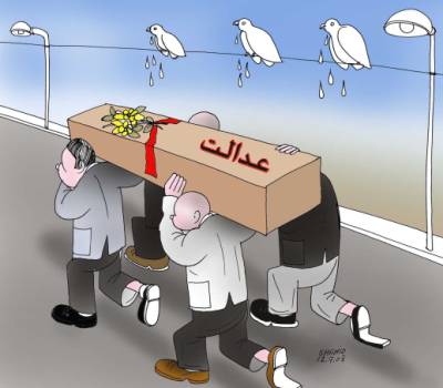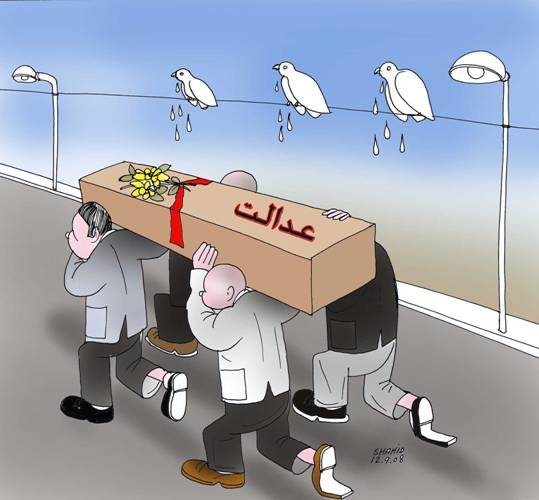 هنرمند عزیز آقای شاهد، اگر به جای پتلون پوشان که جنازه را حمل می کنند، چند تا پکول پوش و لنگی پوش و نکتایی دار با تفنگ و راکت و پیکا می آمد، کارتون جالب تر می شد، زیرا همین افراد عدالت را به گورستان سپرده اند.