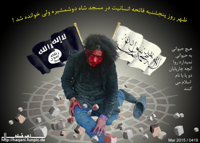 حالا بعد ازین حادثه المناک و مرگ نابهنگام انسانیت فضای شهر کابل دستخوش تغیرات غیر قابل تصوری شده و در دوکان های بقالی دیگر بجای امتعه انسانی چون مسرت و شادمانی ، دوستی و محبت ، شعور و منطق ، رحم و عاطفه کالا های اسلام وهابی و سلفی چون ذبح اسلامی و سنگسار ، آتش سوزی و کشتار و قمچین و کیبل به فروش می رسد.