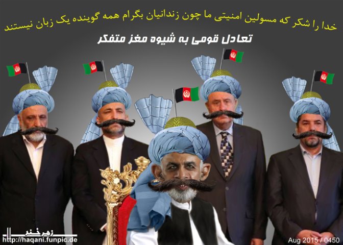 حالا این از کمال نمک حرامی و نا سپاسی هموطنان فارسی زبان ما خواهد بود که بجای اینکه مدیون این لطف و کرم ملا ااشرف غنی باشند که ایشان را از زندان بگرام رها کرده و پانزده فیصد آنها را در قدرت سیاسی و مناصب عالی حکومتی سهیم گردانیده از ایشان انتقاد نمایند و ادعا کنند که جلالتماب ایشان فقط در زندان بگرام خواهان برقراری تعادل قومی می باشند.