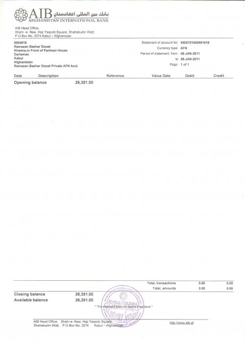 سه حساب بانکی دارم که در یک آن چهار صد افغانی است ودر حساب بانکی دوم من بیست وشش هزار و سه صدو پنجاه و یک افغانی و در حساب سوم من یکصد و یک آیرو یعنی در حدود شش هزار افغان است.