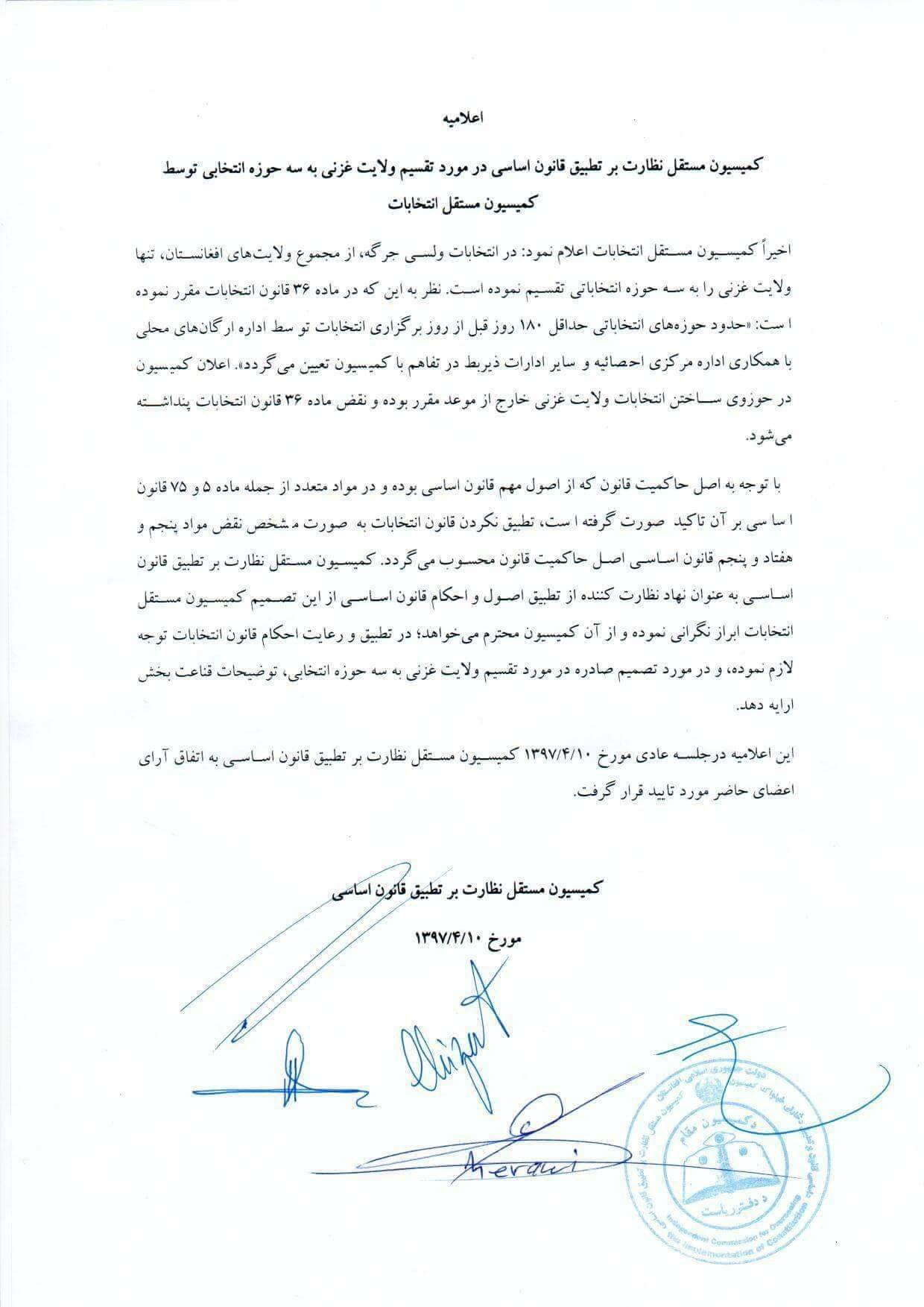 کمیسیون نظارت بر تطبیق قانون اساسی: تقسیم غزنی به سه حوزه انتخاباتی خلاف قانون است