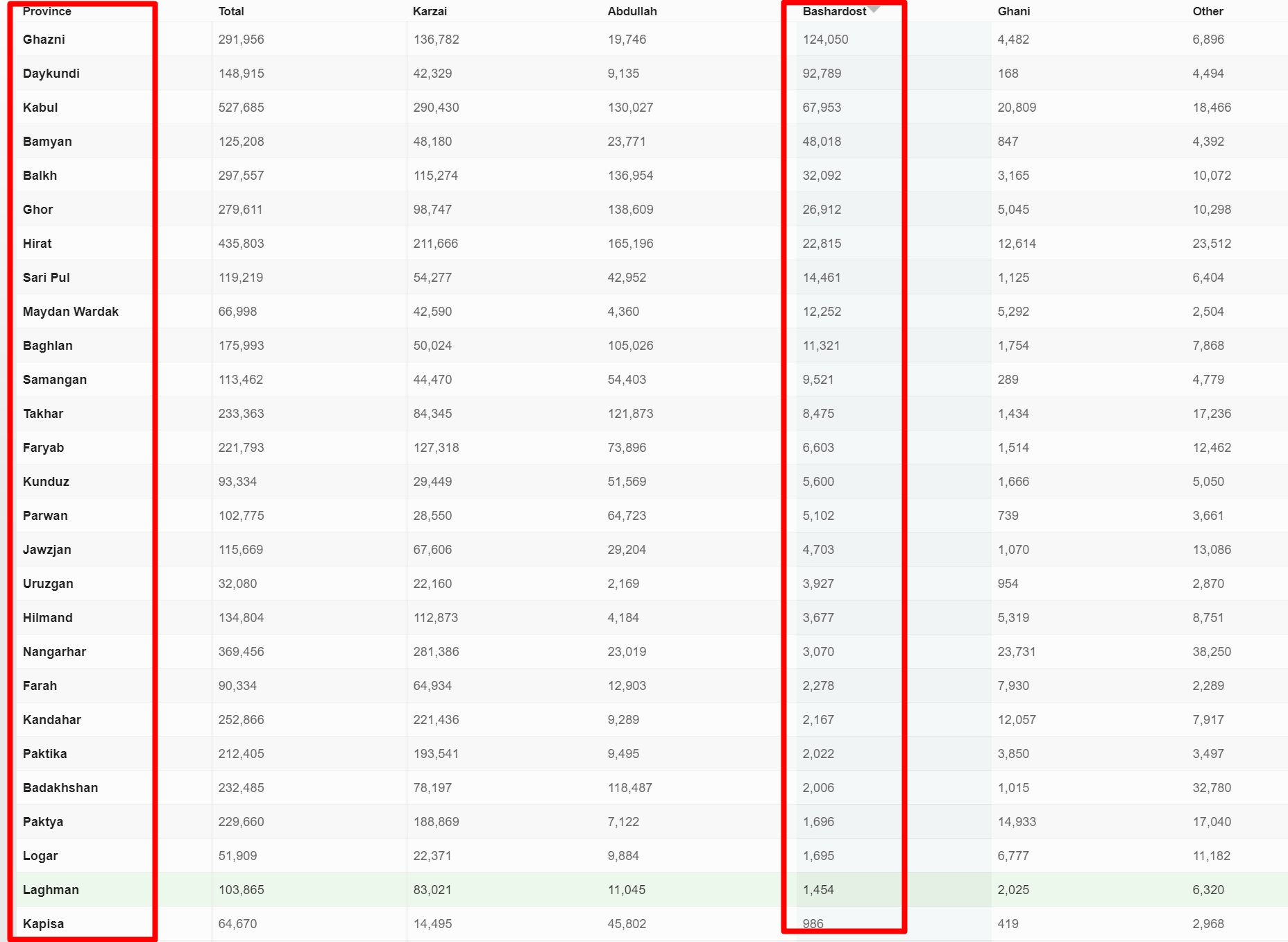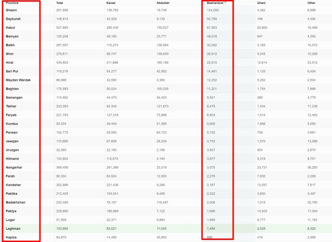 آمار رسمی از انتخابات ریاست جمهوری سال 2009 میلادی نشان می دهد که بیشتر از 90 درصد آرایی بدست آورده توسط آقای بشردوست از مناطق غیر پشتون نشین بويژه هزاره نشین بوده است. برای نمونه در دایکندی حدود 70% و در غزنی حدود 61% به بشردوست رای داده بودند. در همین حال رای آقای بشردوست از مناطق پشتون نشین کمتر از 5% بوده است. منتقدان می گویند آقای بشردوست گفته ی مشهوری برای مردم دارند که "پلو و چلو آن ها را بخورید، اما به انسان های بشردوست و انسان دوست رای دهید". این گفته ی آقای بشردوست به گونه ی دیگری در مورد خود او اتفاق افتاده است: بسیاری از پشتون ها به او می گویند که به او رای خواهند داد اما در عمل به پشتون های خود رای می دهند. انتخابات ریاست جمهوری سال 2009 و دو انتخابات پارلمانی نمونه واضح آن بود.