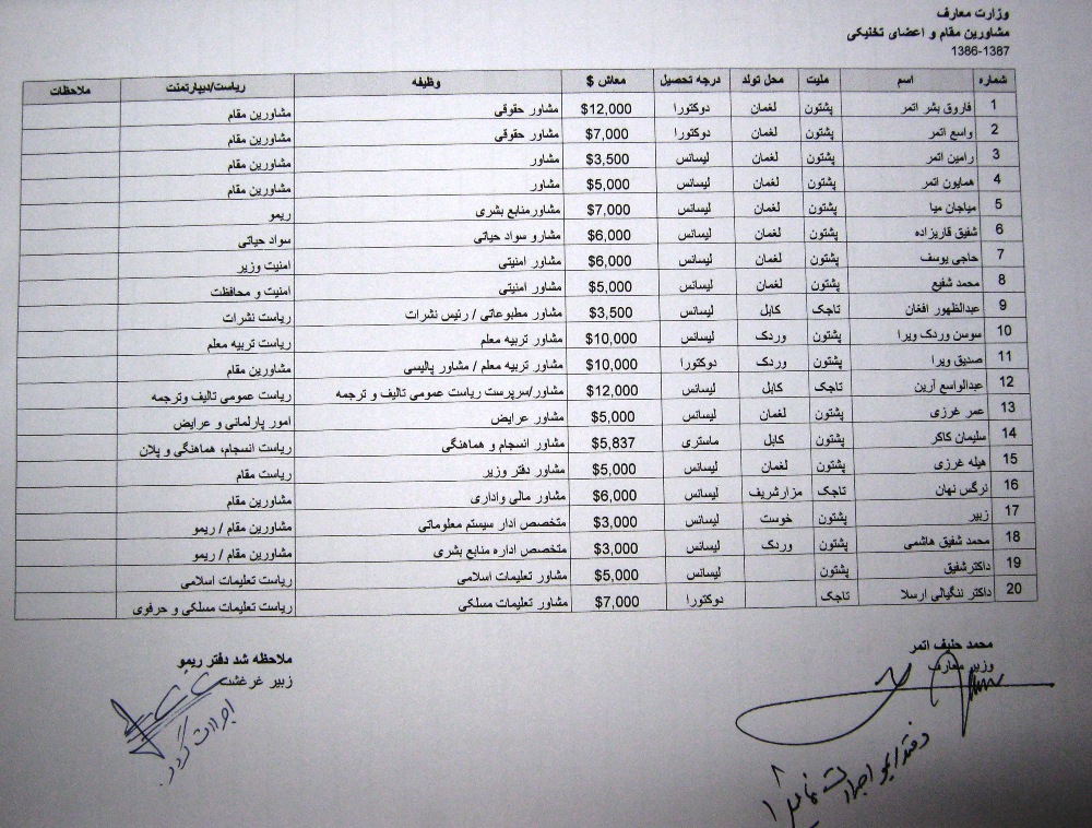 به این سند فاش شده از نوع تقسیم پست و موقعیت در اداره تحت مدیریت حنیف اتمر نگاهی بیاندازید: