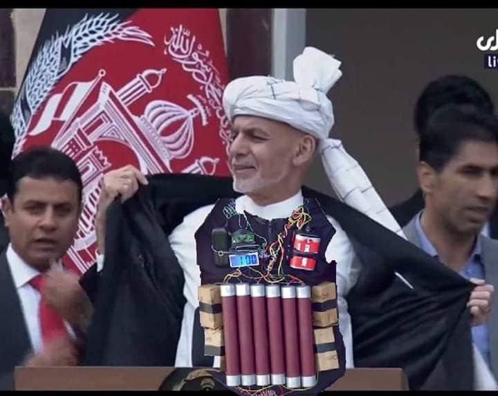 این تصویر فتوشاپ شده واکنش کاربران شبکه های اجتماعی را به دروغگویی و نمایش اشرف غنی احمدزی و برادران طالب و انتحاری اش نشان می دهد.