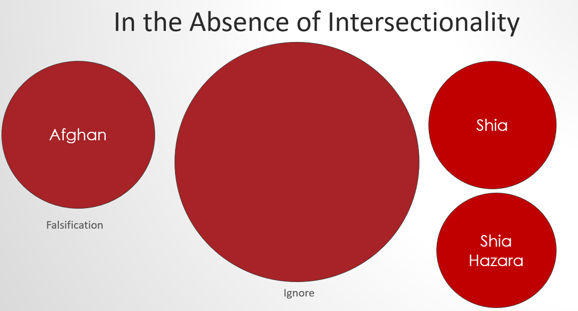 Intersectionality is new in the Hazara context, but it is coming to be more studies. However, most of the existed research projects ignore or unintentionally fall into a dominant narrative that a) Hazara are Shia, b) Hazara are Afghan, c) Hazara are descendants of Mongolian soldiers from the 13th century, d) and Hazara are a minority group. It is while a significant part of the Hazara is Sunni, Ismaili, Christian, or non-believer (Council of Sunni Hazara, 2016; Shariati, 2018; Yale MacMillan Center, 2018); still, after a long-term experiencing ethnocratic and ethno-clerical regimes, Afghan could not become an acceptable identity (Lewis, 2011; Raofi, 2018); historical evidence, including the Buddhas of Hazaristan in ancient Bamyan (Poets World-wide, 2017) confirm Hazara’s history, and so far, no genetic study with DNA samples confirms that Hazara are descendants of Mongolian soldiers (Das & Upadhyai, 2019; Gary, 2008; Li et al., 2008). There is also no reliable data and census about the population of the country. Such dominant narrative within literature supports the narrative of oppression against the Hazara, which impacts greatly in many aspects of their life.