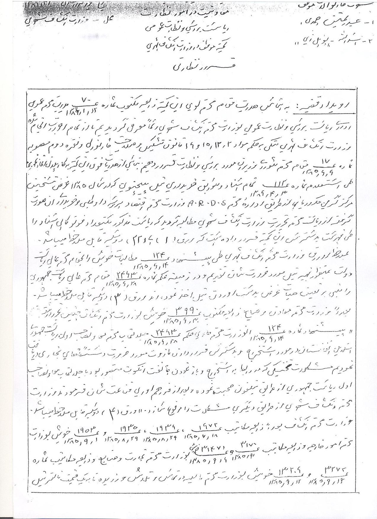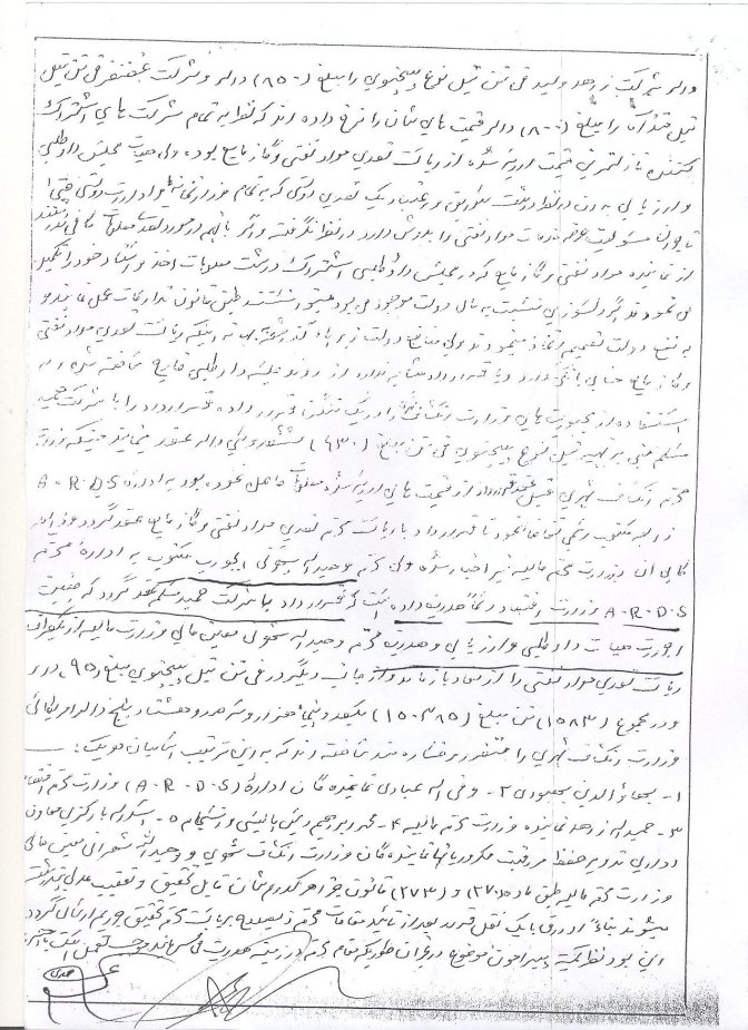 که نازلترین قیمت از ریاست تصدی مواد نفتی و گاز مایع بوده ولی هیئت مجلس داوطلبی و ارزیابی بدون در نظر داشت سوابق و اعتبار تصدی دولتی که به تمام وزارت خانه ها، ادارت دولتی و حتی تاجران مسئولیت عرضه خدمات مواد نفتی رابدوش دارد. در حالیکه وزارت اقتصاد ذریعه مکتوب رسمی تقاضا نموده تا قرار داد با ریاست تصدی مواد نفتی و گاز مایع عقد گردد، که کاپی آن به وزارت مالیه نیز اخبار گردیده بود ولی محترم وحید الله شهرانی به جواب مکتوب وزارت اقتصاد رسمآ هدایت داده است که قرار داد با شرکت حمید مسلم عقد گردد. که چنین اجراات هیئت داوطلبی و ارزیابی و هدایت محترم شهرانی معین مالی وزارت مالیه از یکطرف ریاست تصدی مواد نفتی را از مفاد باز مانده و از جانب دیگر در فی تن تیل پیچوی مبلغ 95 دالر و در مجموع 1583 تن به مبلغ 385، 150 دالرامریکائی وزارت انکشاف شهری را متضرر و خساره مند ساخته اند. که اسامیان هریک: