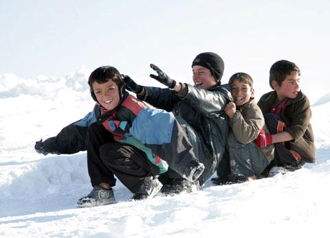 Afghanistani boys enjoying the recent snowfall in the Khair Khana neighbourhood of Kabul.