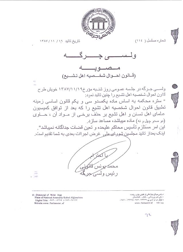 من یک مسلمان شیعه هستم اما تصویب این قانون را توهین به ارزشهای انسانی میدانم. این قانون فقط زمینه ی استحمار مذهبی را برای ملاهای دینی فراهم می نماید. این قانون مسیر رشد سیاسی هزاره ها را سد می نماید. این قانون به اشاره واستخاره ایران و به همکاری عمال ایرانی و درجهت تامین منافع ایران وبرای ضربه زدن بر هزاره ها تدوین گردیده است. وسلام. تصویب این قانون مصیبت عظیمی است برای هزاره ها.