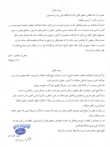 تاييد قانون احوال شخصيه شيعيان افغانستان ازمنظر، مرجع تقليد حضرت آيت الله العظمي محقق كابلي (حفظه الله)